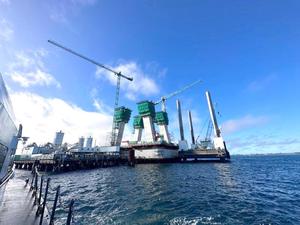 Trabajadores del puente protestan otra vez en la pila central en el Chacao